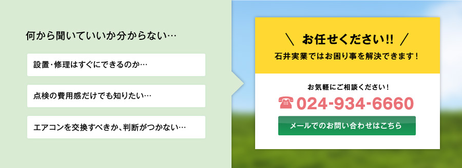 休むことなく働き続けている空調・電気等の設備機器は、定期的な点検整備が欠かせません。 故障を未然に防ぐメンテナンスと、早期の訪問作業契約です(弊社は郡山市)。 お客様の営業を休むことなく、スピードリニューアルいたします。 <主なサービス内容> 事務所・病院・工場などで使用する業務用空調機の保守点検 冷房暖房機の点検及び修理 フロンガスの回収及び修理