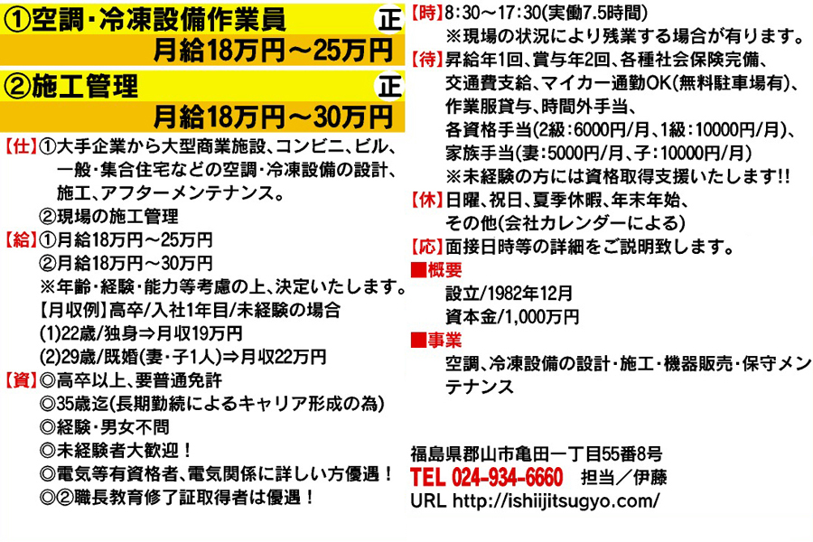 ただいまアフターメンテナンスや企画提案などを担当する正社員を募集しています。 詳細はお電話にてお問い合わせください。024-934-6660 担当:伊藤